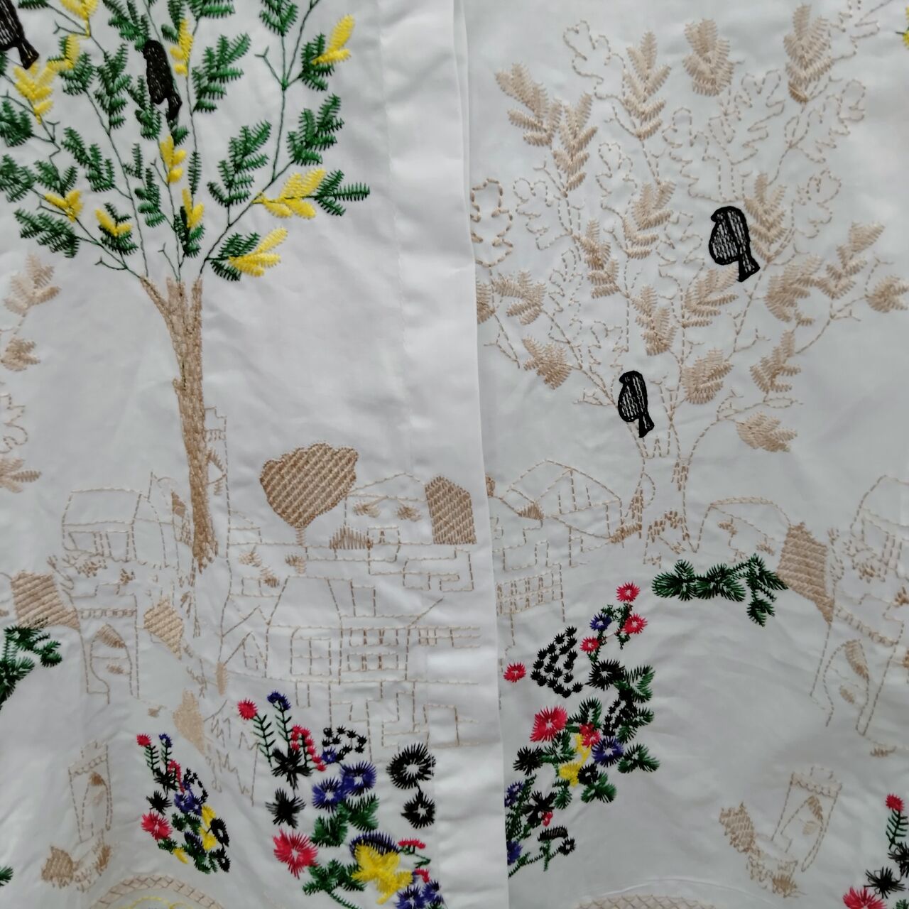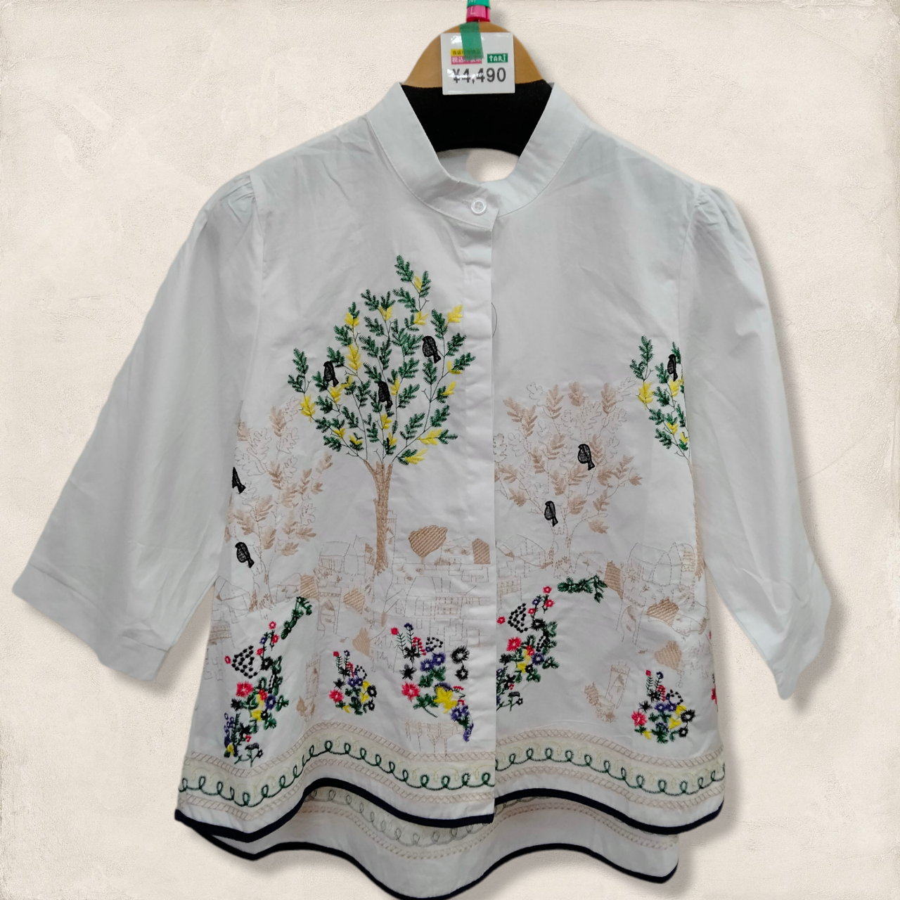 鳥や花、家などが刺しゅうで描かれた華やかなブラウスです。
