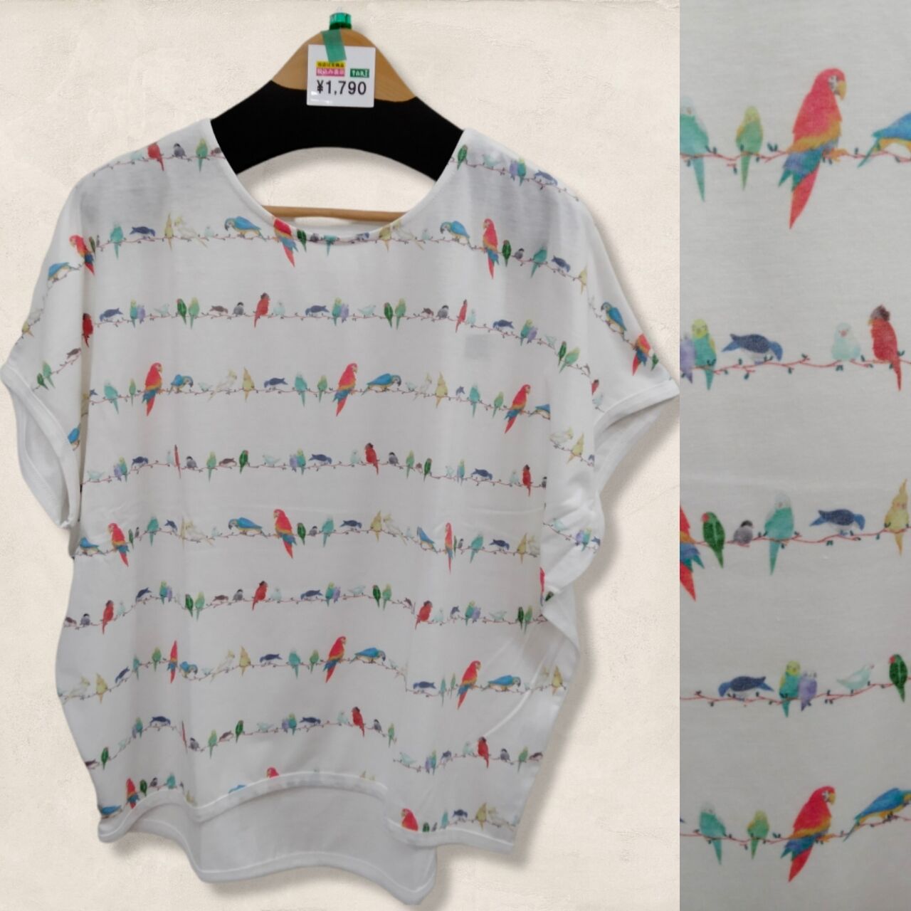 カラフルな鳥の柄です。