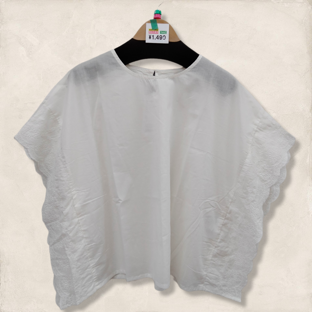 両サイドにカットワーク刺繍をほどこしたポンチョ風のブラウス。